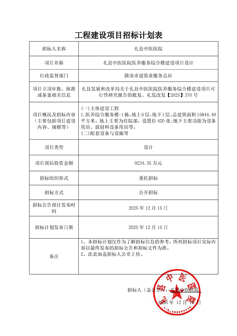 禮縣中醫(yī)醫(yī)院醫(yī)養(yǎng)服務(wù)綜合樓建設(shè)項目設(shè)計